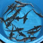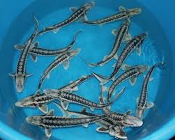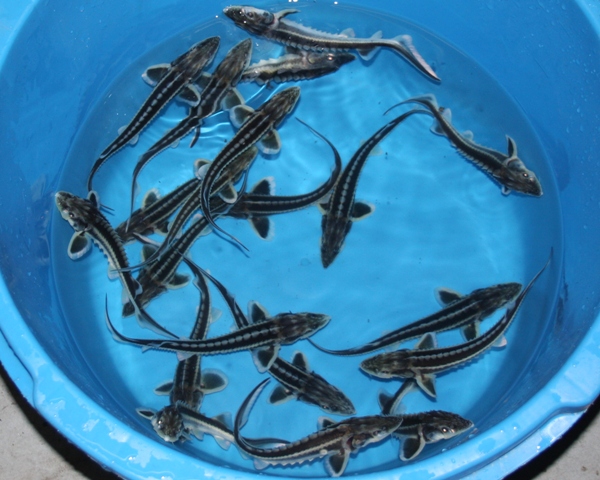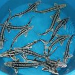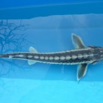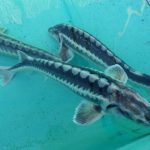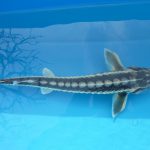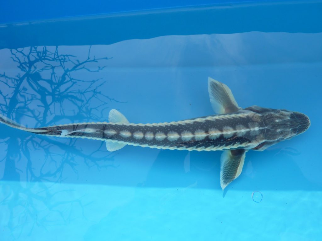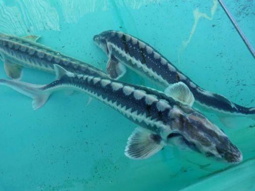Diamantsteur of Russische steur (Acipenser Gueldenstaedti): prachtige tekening/ronde neus/3rijen witte beenplaten/gebruikt de gehele vijver, niet alleen de bodem/ kan in gevangenschap zo’n 1.30 meter worden/gemakkelijk hand-tam te krijgen. Zebrasteur: een licht gekweekte vorm van de diamantsteur.