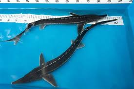 Stellatussteur (Acipenser Stellatus): lijkt op de Gueldenstaedti maar is ranker/lange afgeronde snuit die wel op een eendensnavel lijkt/meest beweeglijke/levendige steur die ook makkelijk uit het water springt, moet dus terug kunnen de vijver in, opstaande randen kan dan een probleem zijn.
